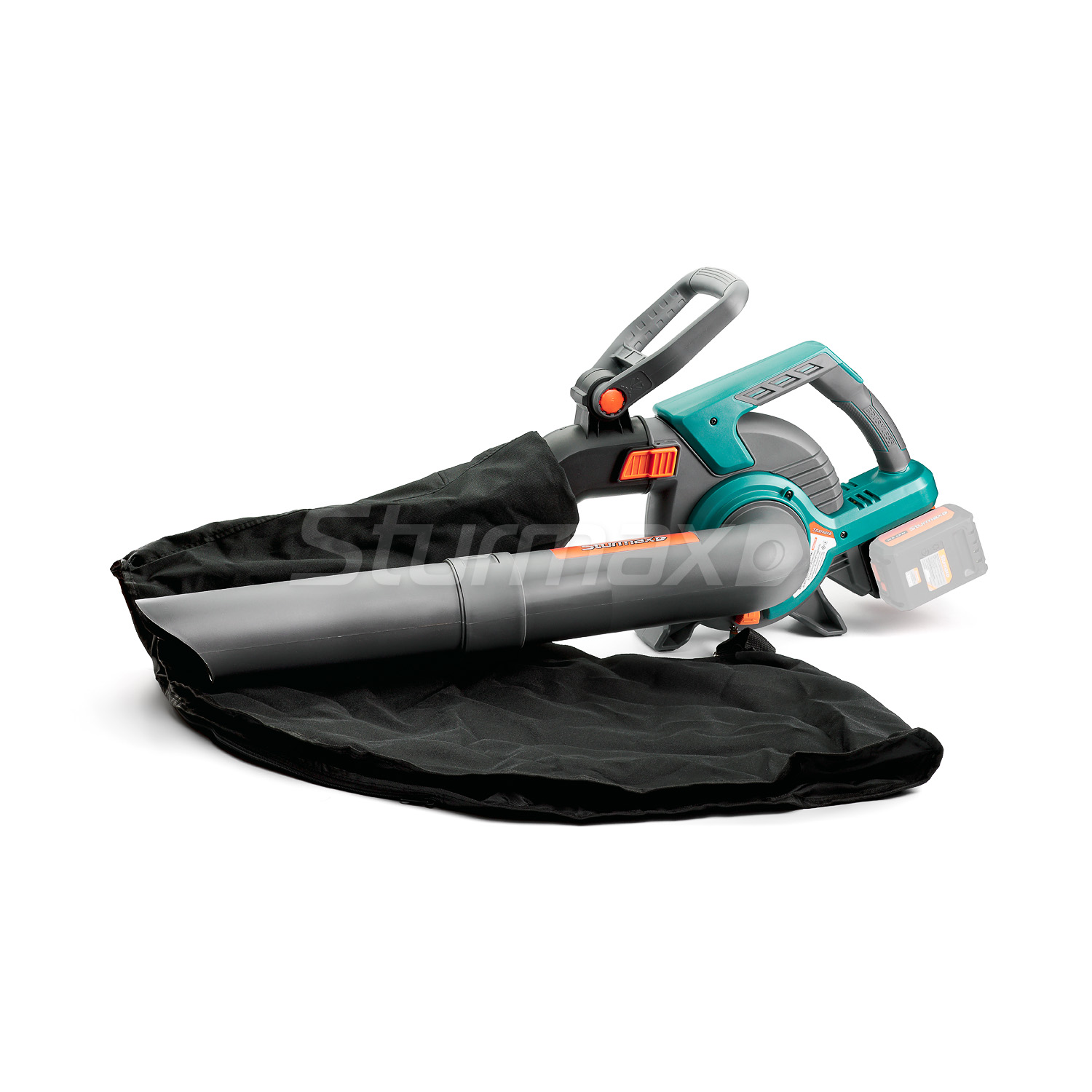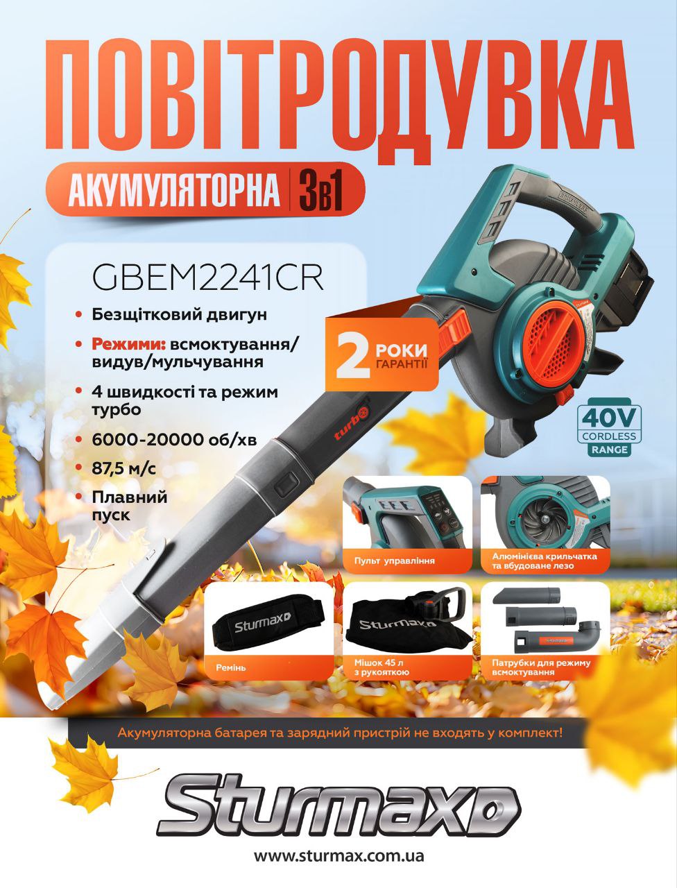 Повітродувка акумуляторна Sturmax GBEM2241CR – акумуляторна 40В повітродувка. Живлення пристрою забезпечується двома 20В акумуляторами, які можна використовувати і для інших інструментів єдиної акумуляторної платформи Sturmax Cordless Range. Повітродувка призначена для швидкого та ефективного прибирання ділянок від сухого і вологого листя, скошеної трави, пилу, піску, дрібного будівельного сміття тощо. Ідеально підходить для прибирання садових доріжок, терас, гаражів, подвір’їв, а також для догляду за ділянками після стрижки газону чи обрізки кущів. Важливою конструктивною особливістю Sturmax GBEM2241CR є безщітковий двигун, який у порівнянні з колекторними аналогами демонструє кращу продуктивність на одному заряді АКБ, а також стійкість до можливих перевантажень. Повітродувка має чотири швидкості роботи, а також TURBO режим для максимальної швидкості повітряного потоку. Передбачені три режими: видування, всмоктування, мульчування. Режим видування допомагає швидко прибрати сухе листя, пил і дрібне сміття з доріжок, газону чи тераси; всмоктування перетворює повітродувку на зручний садовий пилосос, дозволяючи збирати опале листя та дрібні гілки без зайвих зусиль; функція мульчування подрібнює зібране сміття, суттєво зменшуючи його об’єм і полегшуючи утилізацію чи подальше використання як органічної мульчі для клумб і грядок. Наявність функції плавного запуску виключає різкий ривок інструмента при старті, а також знижує навантаження на двигун і акумулятор. Ергономічна прогумована рукоятка зменшує вібрації та підвищує комфорт при тривалому використанні, а вбудований пульт керування сприяє зручному налаштуванню оптимального режиму роботи. У комплект до інструмента входять ремінь та 45-літровий мішок для збору сміття зі спеціальною ручкою.