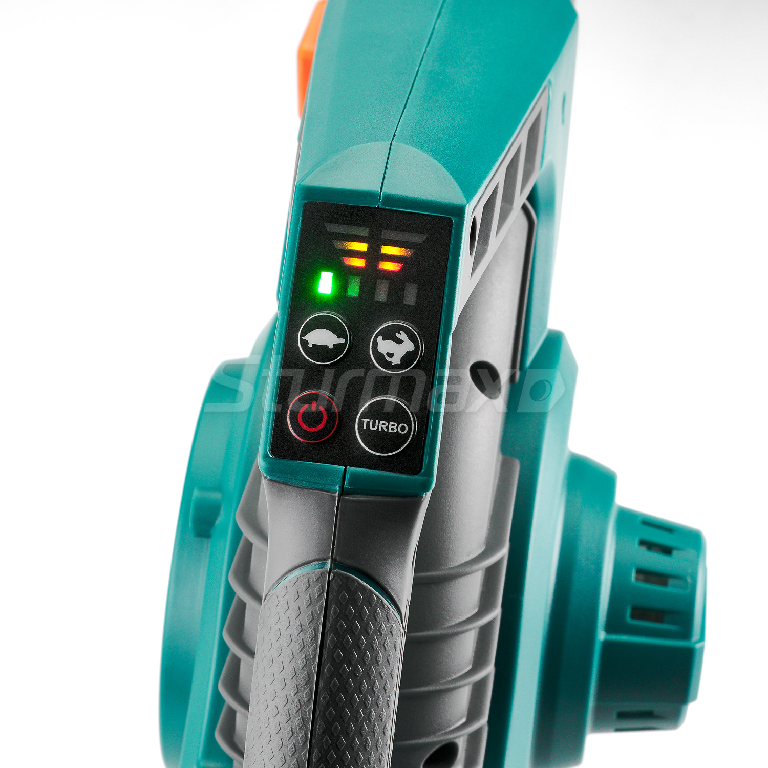 - Чотири швидкості роботи + режим Turbo – дозволяють точно налаштовувати повітряний потік під конкретне завдання: від делікатного прибирання сухого листя на клумбах до потужного видування вологого сміття чи будівельного пилу; режим Turbo забезпечує максимальну продуктивність при короткочасних навантаженнях, наприклад, для очищення щілин, важкодоступних ділянок або щільних забруднень.
