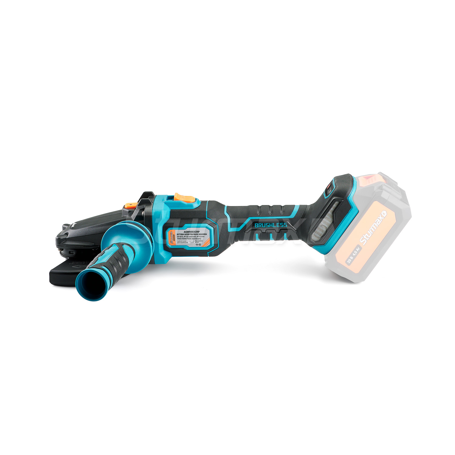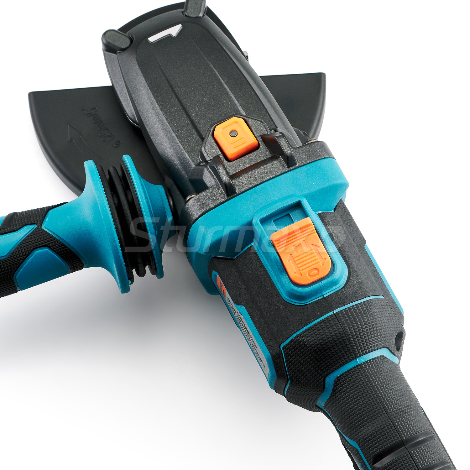 Акумуляторна болгарка Sturmax AGM9003CRP Professional – акумуляторна 20В болгарка (КШМ) лінійки інструменту Sturmax Cordless Range на єдиній акумуляторній платформі. Завдяки оптимальному компонуванню модель чудово лежить у руці, збалансовані масогабаритні показники сприяють кращому контролю інструмента навіть під час роботи у важкодоступних місцях, а відсутність прив’язки до електромережі значно підвищує маневровість. Важлива особливість Sturmax AGM9003CRP – наявність потужного безщіткового електродвигуна. Завдяки цьому підвищується стійкість до перевантажень і забезпечується вища продуктивність роботи на одному заряді АКБ. Крім того, такий двигун не схильний до перегріву та дозволяє довше працювати без перерви. Наявність константної електроніки дозволяє підтримувати стабільні оберти під навантаженням, гарантуючи рівномірну швидкість різу та високу якість обробки матеріалу. До переваг моделі варто віднести функцію захисту від ривка та віддачі KickBack, а також можливість регулювання кількості обертів (3000 / 3000 / 7500 об/хв). Для більшої зручності та скорочення часу на підготовчі дії болгарка комплектується захисним кожухом із швидкозатискним кріпленням.